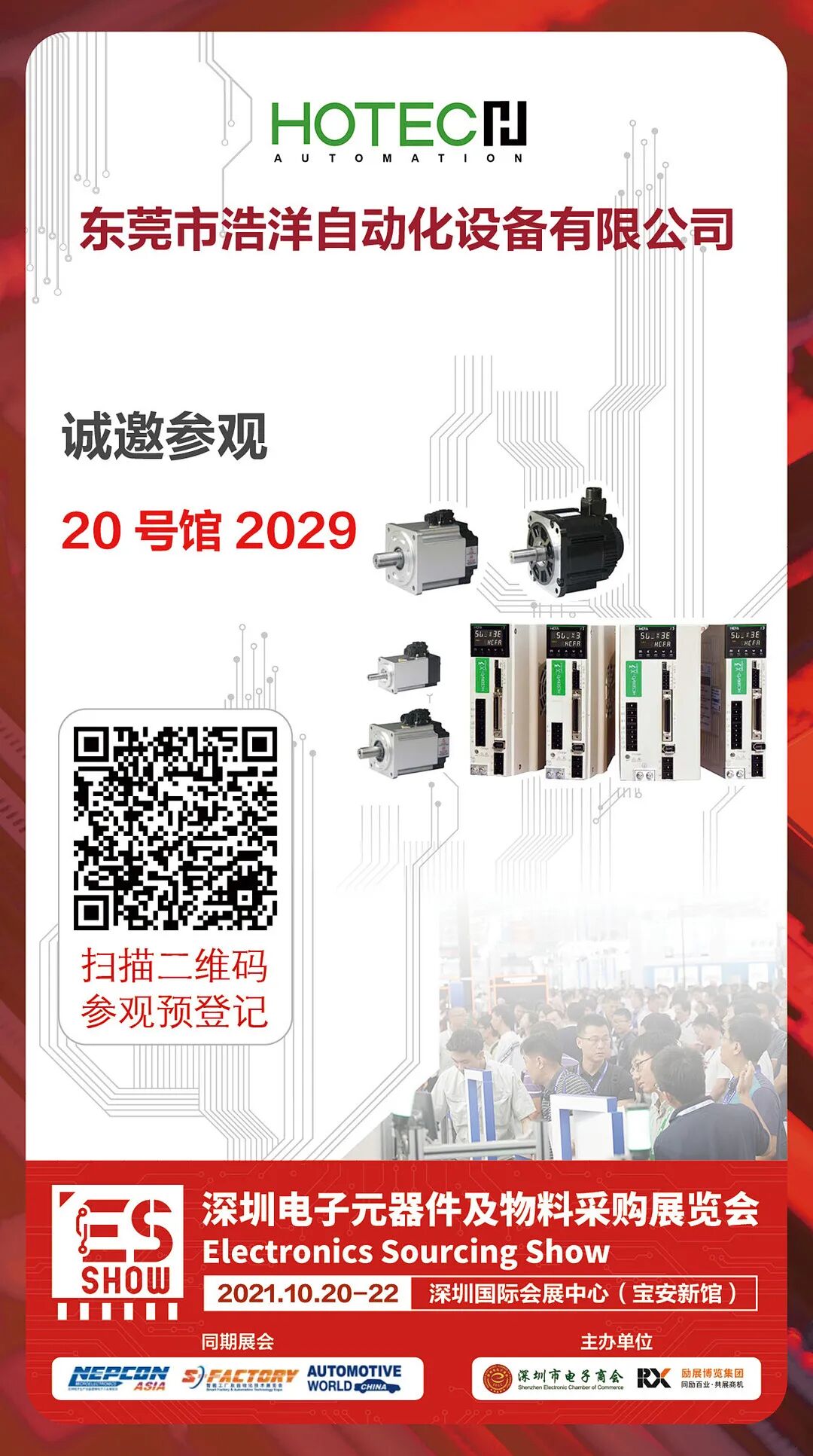 2021 深圳電子元器件及物料采購展覽會,將于10月20-22日在深圳國際會展中心(寶安)閃亮登場,隆重開幕。東莞市浩洋自動化設(shè)備有限公司期待你的到來,展位號2029,趕緊收下此邀請函,碼上登記,我們不見不散!