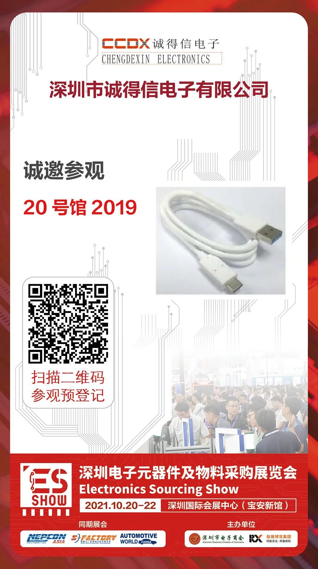 2021 深圳電子元器件及物料采購展覽會,將于10月20-22日在深圳國際會展中心(寶安)閃亮登場,隆重開幕。深圳市誠得信電子有限公司期待你的到來,展位號2019,趕緊收下此邀請函,碼上登記,我們不見不散!