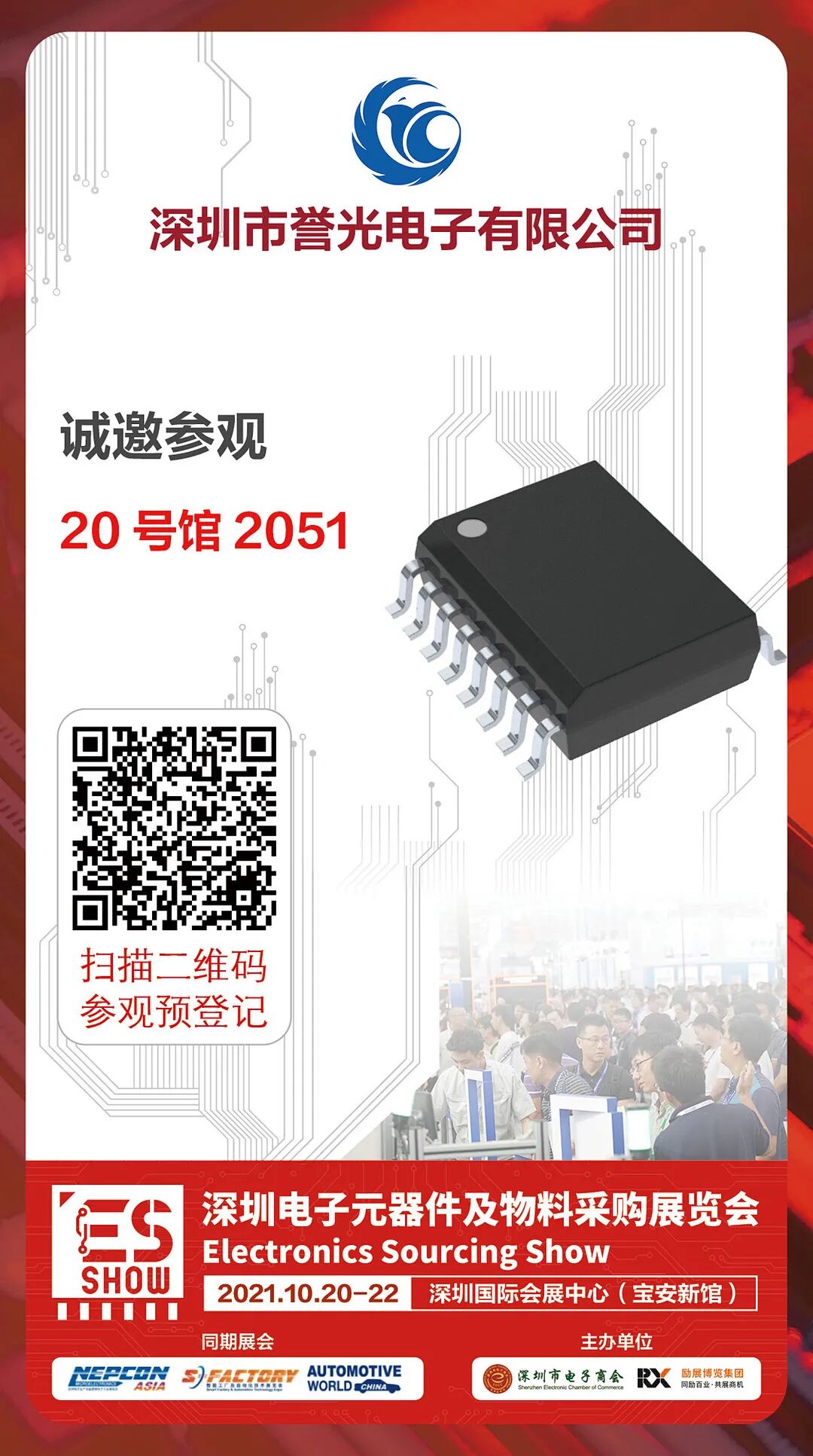 深圳市譽光電子有限公司 譽光國際是一家知名的電子元器件混合分銷商,也是多家國際著名半導體廠商在中國的現(xiàn)貨供應商。公司自創(chuàng)辦以來,一直堅持“正品原裝,品質(zhì)第一”的基本準則。 參展產(chǎn)品: 參展品牌: 專門代理分銷ADI、TI、REALTEK、ST、ALTERA、MAX等國際知名半導體產(chǎn)品。 碼上登記 2021 深圳電子元器件及物料采購展覽會,將于10月20-22日在深圳國際會展中心(寶安)閃亮登場,隆重開幕。深圳市譽光電子有限公司期待你的到來,展位號2051,趕緊收下此邀請函,碼上登記,我們不見不散! 坐穩(wěn)!碼上啟程,搭乘開往ES SHOW 2021的列車!