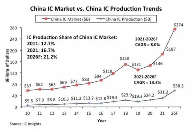 其中IC Insights出具的數(shù)據(jù)顯示,2021年時,國內(nèi)芯片市場規(guī)模約為1865億美元,而中國大陸生產(chǎn)的芯片僅為312億美元,也就是自給率約為16.7%左右。