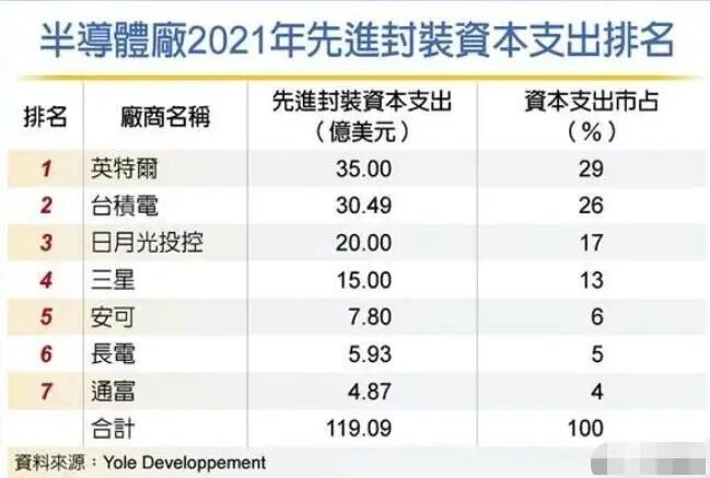 先給一個數(shù)據(jù),這是2021年半導(dǎo)體廠們用于先進封裝技術(shù)的資本支出,前5名分別是英特爾、臺積電、日月光、三星、安可。這5大廠商,貢獻了91%的資本支出。