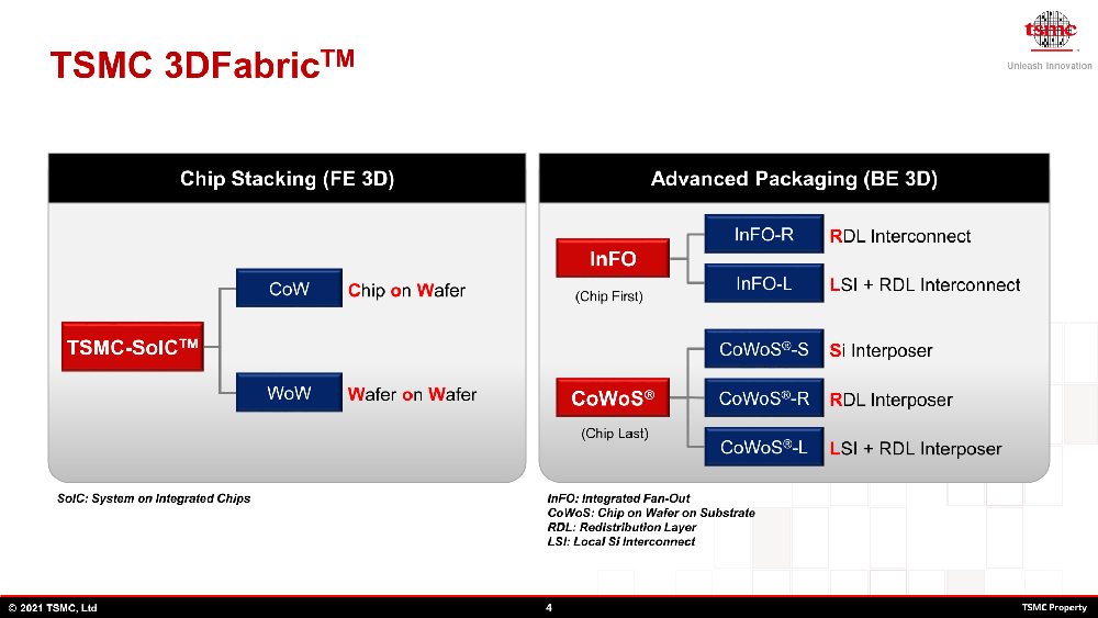 再說先進技術(shù)這一塊,臺積電的CoWoS封裝技術(shù)已發(fā)展到第五代,臺積電已將自身的先進封裝技術(shù)整合為了3DFabric技術(shù)平臺,包含臺積電前端的SoIC技術(shù)和后端CoWoS、InFO封裝技術(shù)。