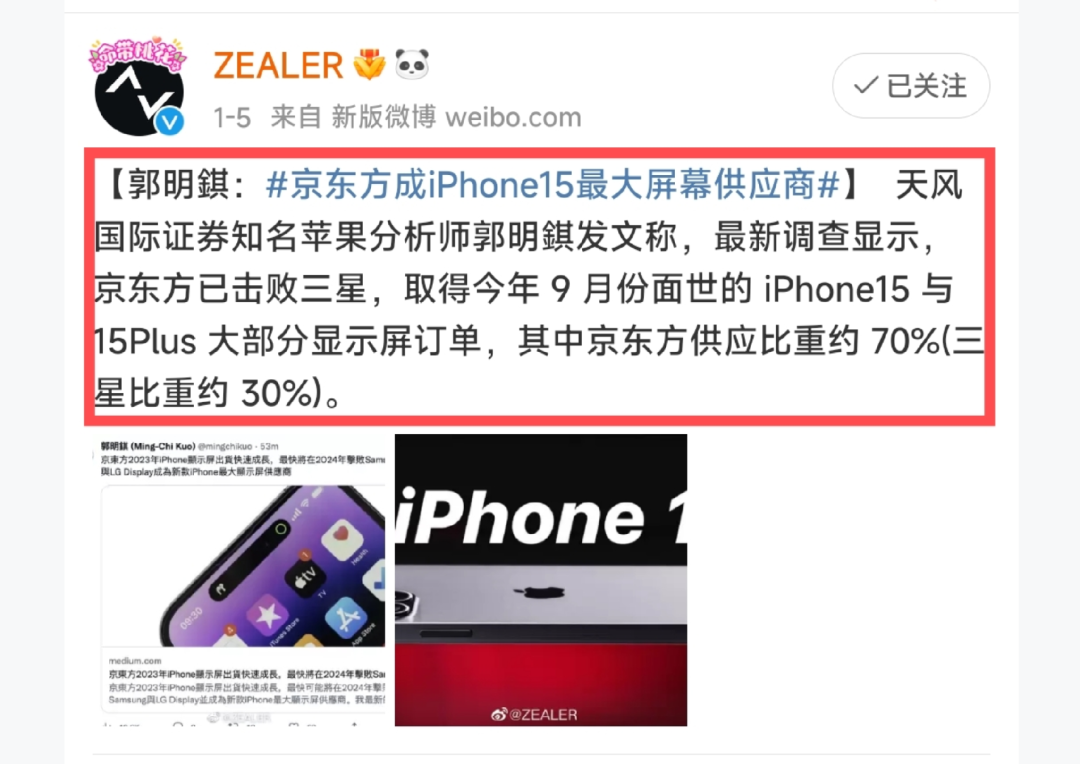 近期關(guān)于蘋果手機的消息比較多,分析師稱京東方成iPhone15最大屏幕供應(yīng)商,份額可能高達70%。