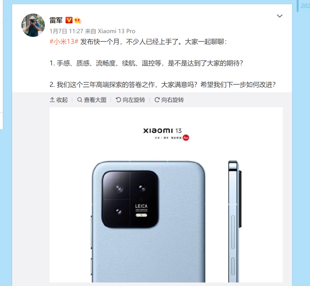 這也從側(cè)面反應(yīng)出了小米13系列被用戶所認可,雷軍稱此為小米沖擊高端市場三年的答卷。雷軍在手機部分總結(jié)會上也表揚了最近半年小米發(fā)力高端的成果,并鼓勵爭取更大的勝利。
