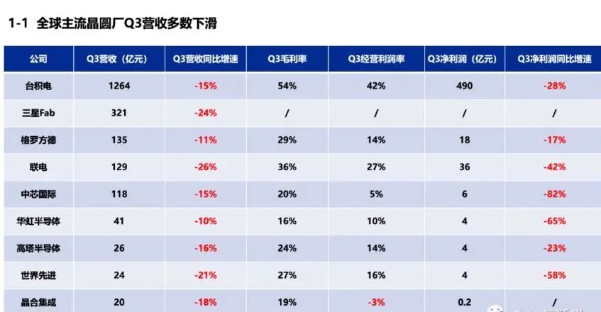 事實上,目前全球芯片產業(yè),依然處于低谷,3季度數據顯示,全球主要的晶圓企業(yè)業(yè)績全線下滑,臺積電、聯電等都沒有意外,全部下滑。