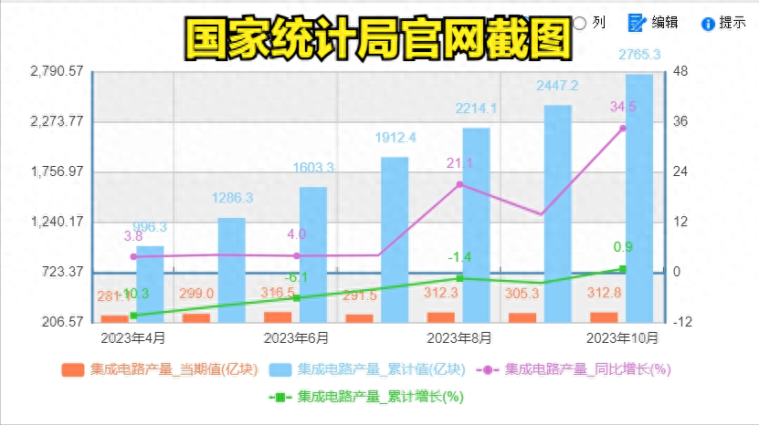 然后從4月份開始,到10月份,中國芯片產量已經連續(xù)正增長了7個月了,但到9月份的時候,累計生產量,還是負增長。直到10月,累計生產集成電路達到了2765億塊,才實現了累計正增長,可見取得這一成績真的不容易。